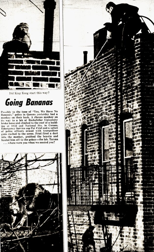 ESU Police Office Pat Friel, ESS Truck 7, runs down an escaped lab monkey. When someone from the crowd shouted out, asking what happened, it was overheard, “T’was beauty, killed the beast“. The monkey however thankfully did survive.