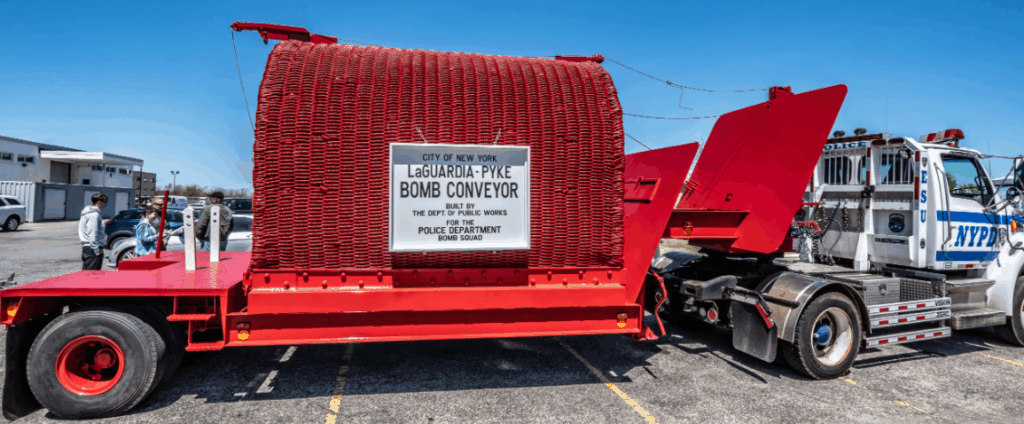 Long before the TCV became a staple of modern bomb disposal, the NYPD’s Bomb Squad relied on a much simpler tool — the LaGuardia-Pyke Bomb Carrier, introduced in the mid-20th century. Named for New York City’s feisty Mayor, Fiorello LaGuardia and the Commanding Officer of the Bomb Squad, Lieutenant James Pyke. The carrier was little more than a heavily reinforced, steel-lined chamber mounted on wheels, designed to carry recovered explosives from a scene to a safe detonation range.