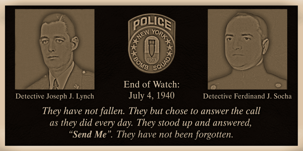 In April 2022, after a year long project, the two weather beaten and rusty LaGuardia-Pyke Bomb carriers were dedicated to the two bomb technicians killed at the 1940 World’s Fair. Two identical bronze plaques, sponsored and created by REMA, were permanently mounted on each bomb carrier, forever reminding us of the sacrifice made by Detectives Joseph Lynch and Ferdinand Socha.